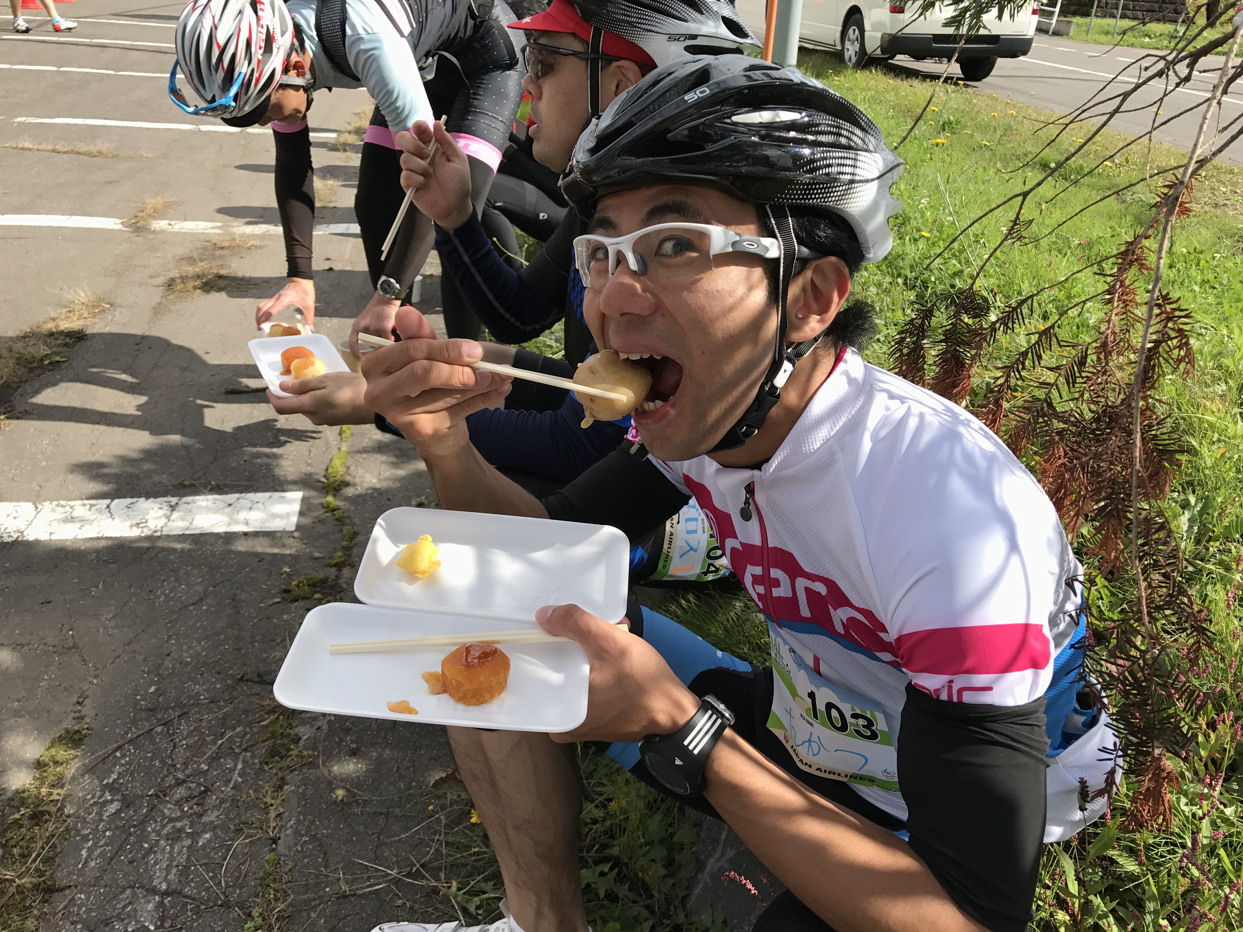 昨年は完走後、帰ろうとする参加者に「私たち一応ゲストなので心折れます」と呼び止めて始まったトークショー。栗村さんらのツールド北海道裏話がとても面白かったんですよね〜。