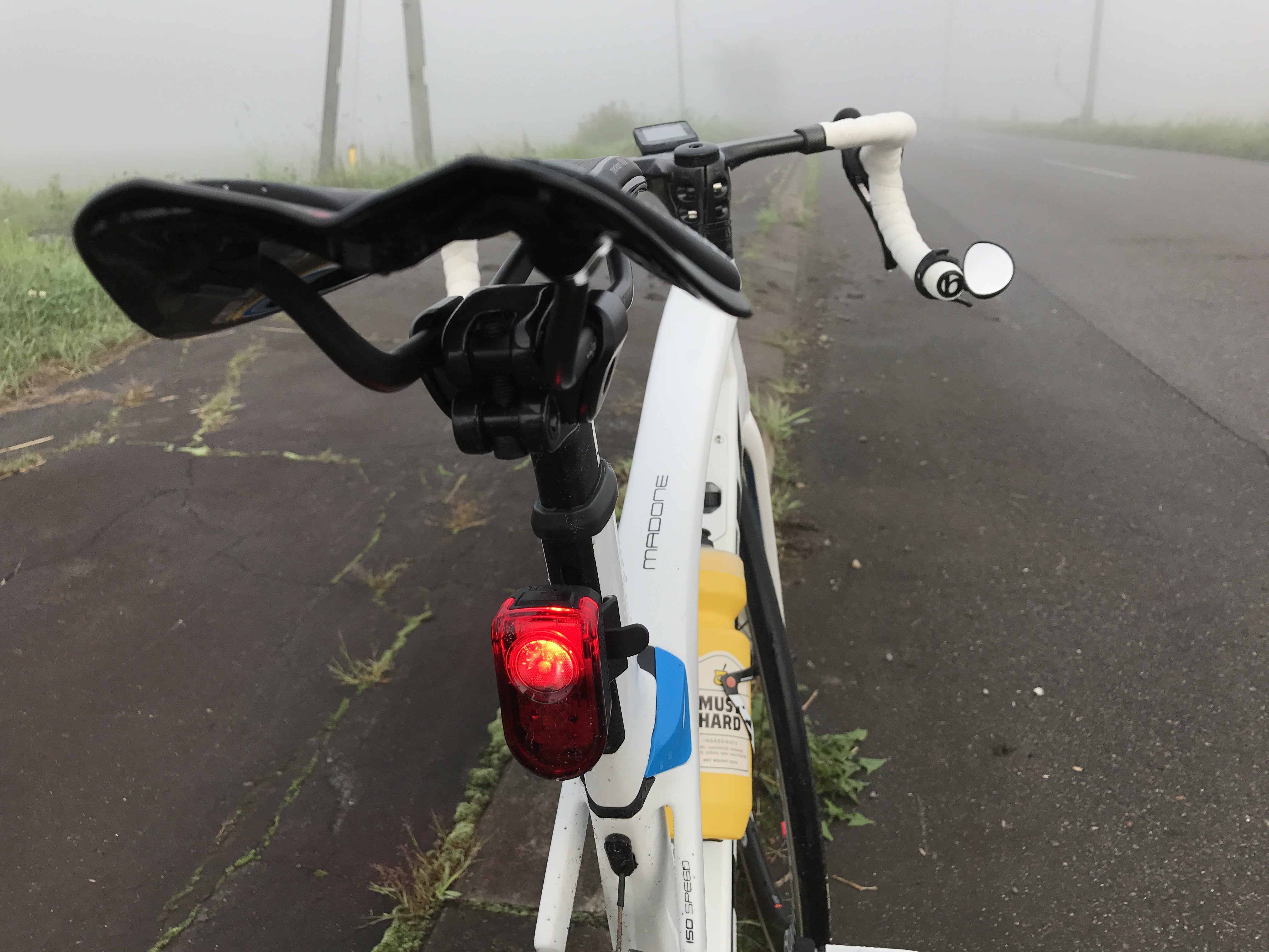 テールライトを、クリップを使ってサドルバッグに取り付けることもできますが、激しい下り坂など揺れる場面が多すぎて暴れやすい。